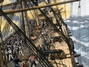 Perry was appointed commander of a new American Lake Erie fleet being built. Perry and his men completed six vessels by July of 1813. On September 10, 1813, Perry was aboard his flagship Lawrence, his “Don’t give up the ship” flag flying. Suddenly the lookout spotted a British squadron, and Perry ordered his ships into action, cannons unleashed.