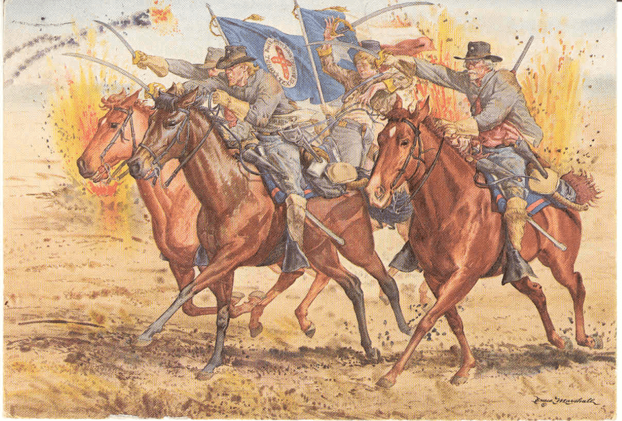 Union General William T. Sherman called them “the most dangerous set of men which the war turned loose upon the world.” The cowboys of of the 8th Texas Cavalry were known as Terry’s Texas Rangers, reckless men who didn’t much like discipline. A Confederate colonel once recommended that the commander of a Union regiment surrender because he had five hundred Texas Rangers that he “couldn’t control in a fight.” One night in Nashville, three or four Rangers slipped out of their barracks, got drunk and went to a play. When the actress playing Pocahontas was “roughed up” as part of a scene, one Ranger took offense and fired his six-shooter at the offending actor. A captured Union officer wrote in a letter: “The Rangers are as quick as lightning. They ride like Arabs, shoot like archers at the mark, and fight like devils. They are wholly without fear themselves, and no respecter of a wish to surrender.”Of the more than 1,000 Rangers who were mustered in, less than 300 returned home. In Austin, Texas there is a bronze statue depicting a Terry’s Texas Ranger wearing a poncho, a slouch hat and carrying a shotgun astride a spirited horse. One of the inscriptions is: “There is no danger of a surprise when the Rangers are between us and the enemy.”