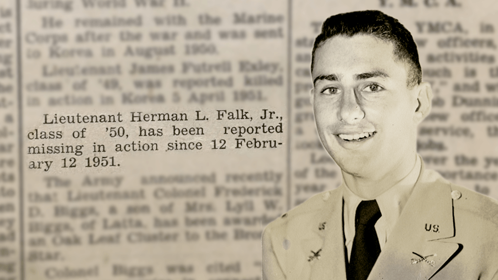 First Lt. Herman Falk, a 1950 graduate of The Citadel in Charleston, South Carolina, went missing with 156 other soldiers from Company B, 38th Infantry Regiment, 2nd Infantry Division, on Feb. 12, 1951, during operations against the Chinese People’s Volunteer Forces near Changboing-ni, Korea.