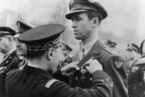 Soon over Luftwaffe airfields, 60 planes swarmed up from bases below. The 389th commander’s plane went down in flames, along with seven others. But all the bombers in Stewart’s squadron made it home. A fellow officer later pointed out, “There were a lot of lives saved that day because he knew what he was doing and when he had to do it.”