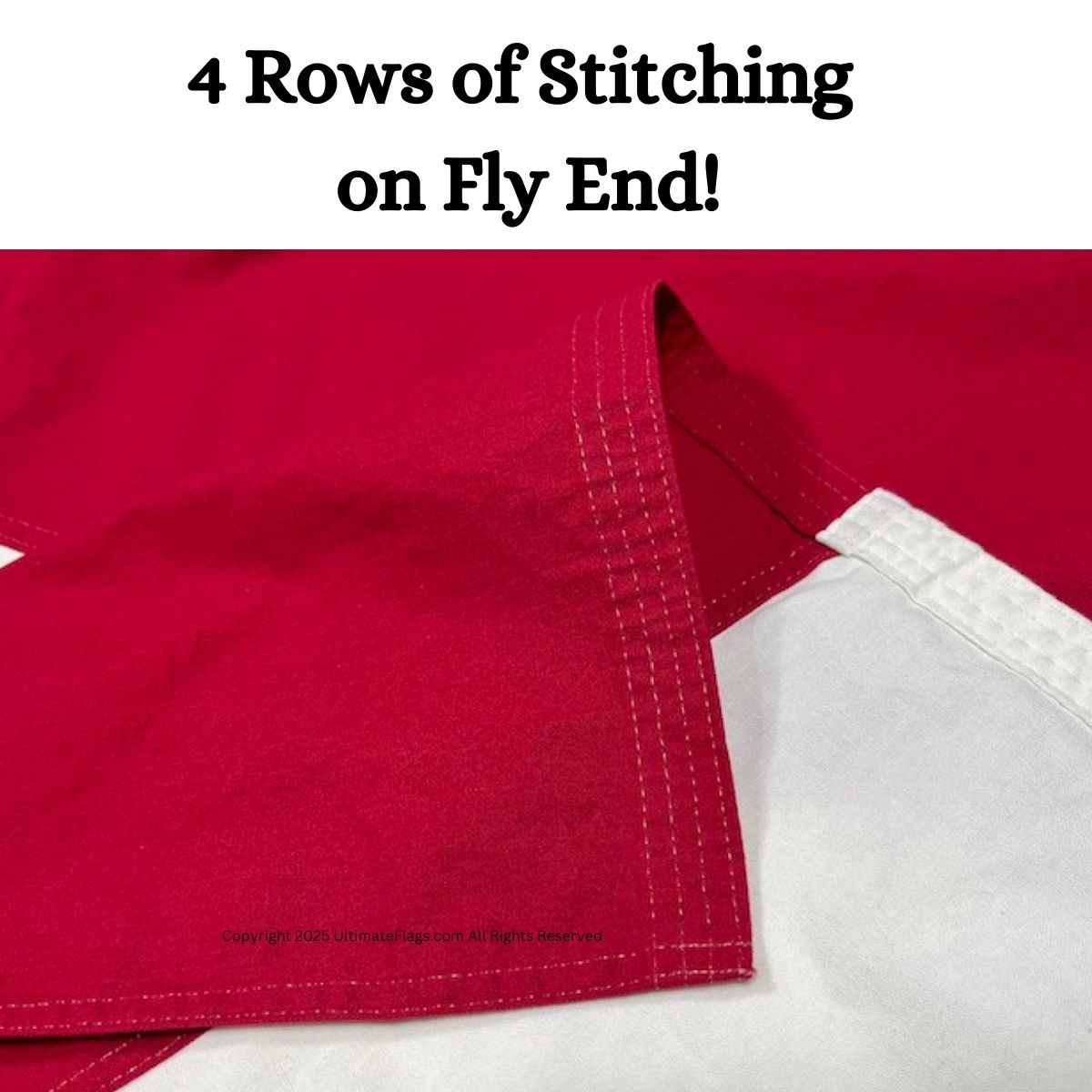 Note on the reverse (backs) of flags: It is standard traditional flag construction that images, words and other adornments on a flag are “backwards” when viewed from behind. It is not correct to sew two standard flags back-to-back in order for them to read the same from both directions.
