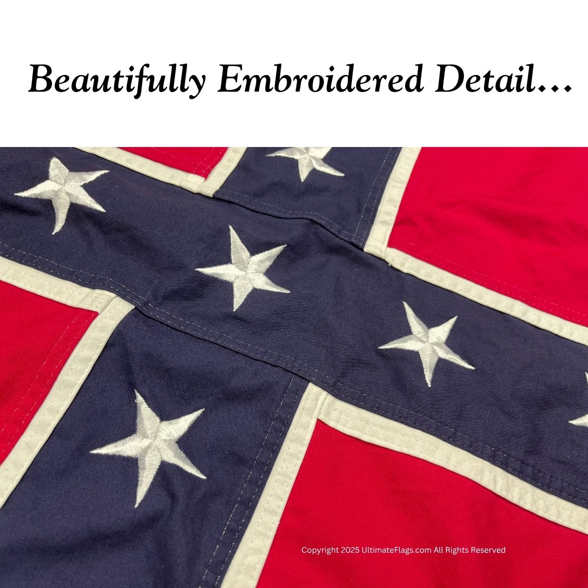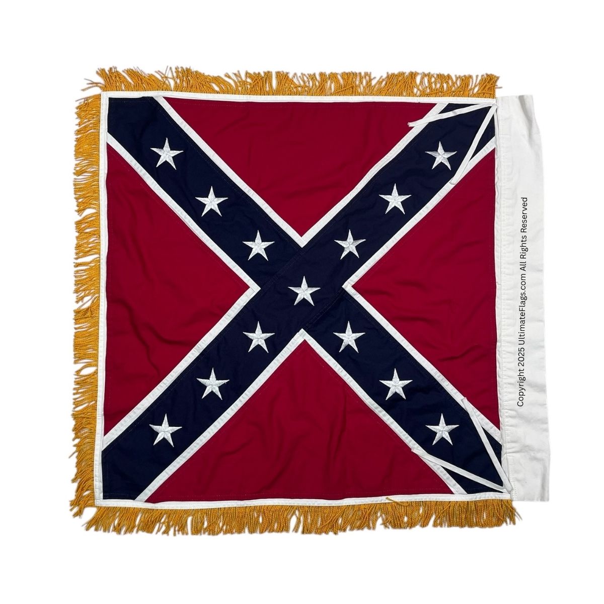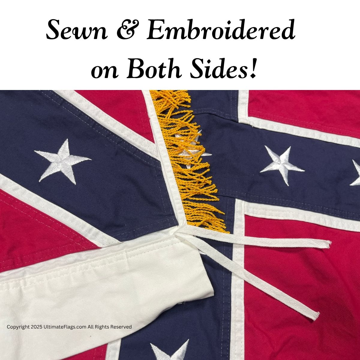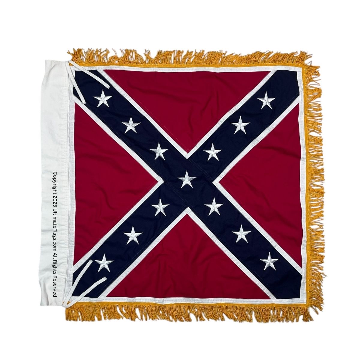 This iconic design was adopted following the First Battle of Manassas (Bull Run) to eliminate confusion between Union and Confederate flags on the battlefield. Featuring a gold fringe border and integrated pole sleeve, this reproduction is made for formal indoor or ceremonial display.