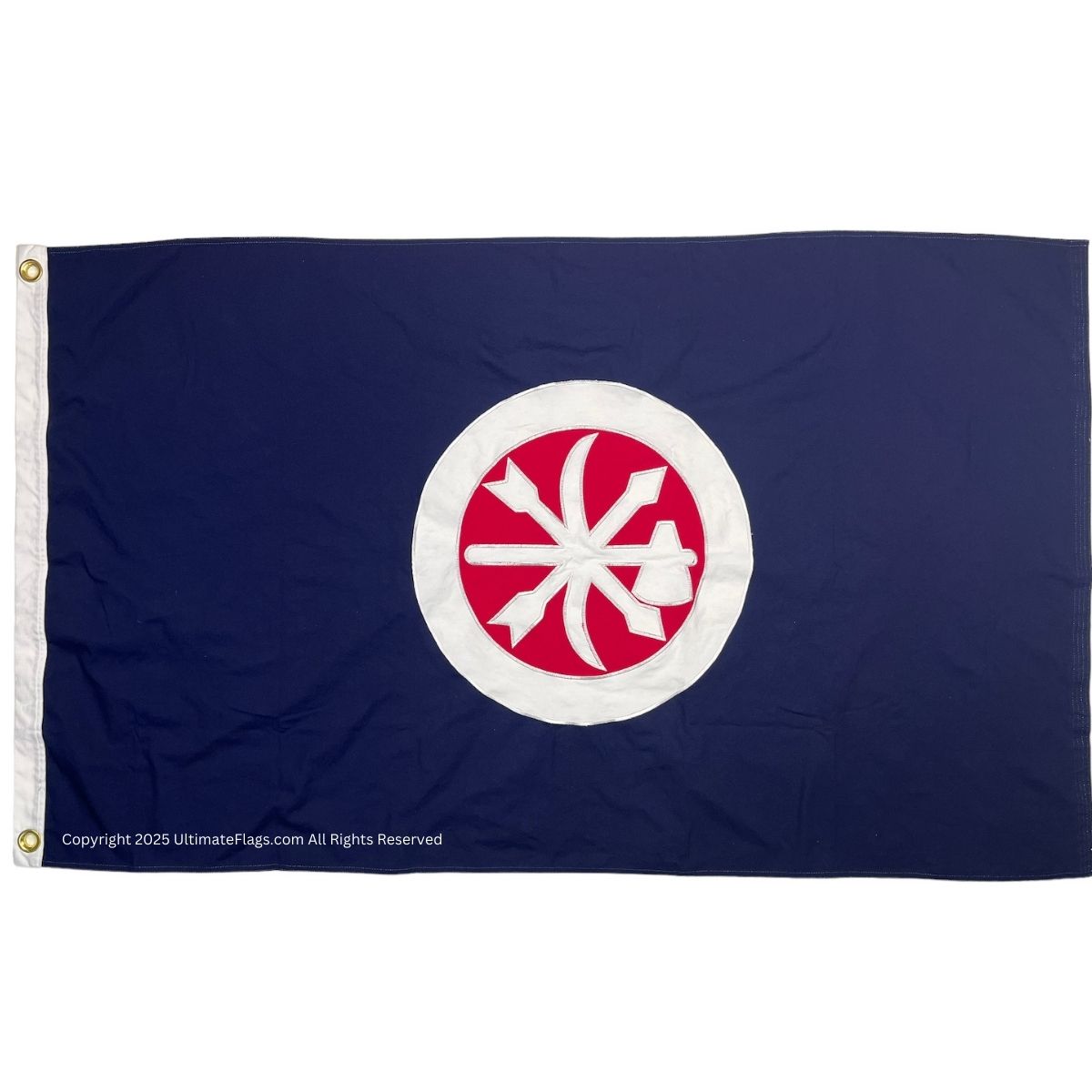 This flag used by Choctaw braves displays some of their traditional weapons. The First Choctaw and Chickasaw Mounted Rifles was formed in 1861. Over 1000 Choctaw warriors dressed as they saw fit, some wearing Euro-American clothing, and others traditional covering. These warriors were known as fierce fighters, and there are many stories of their bravery.