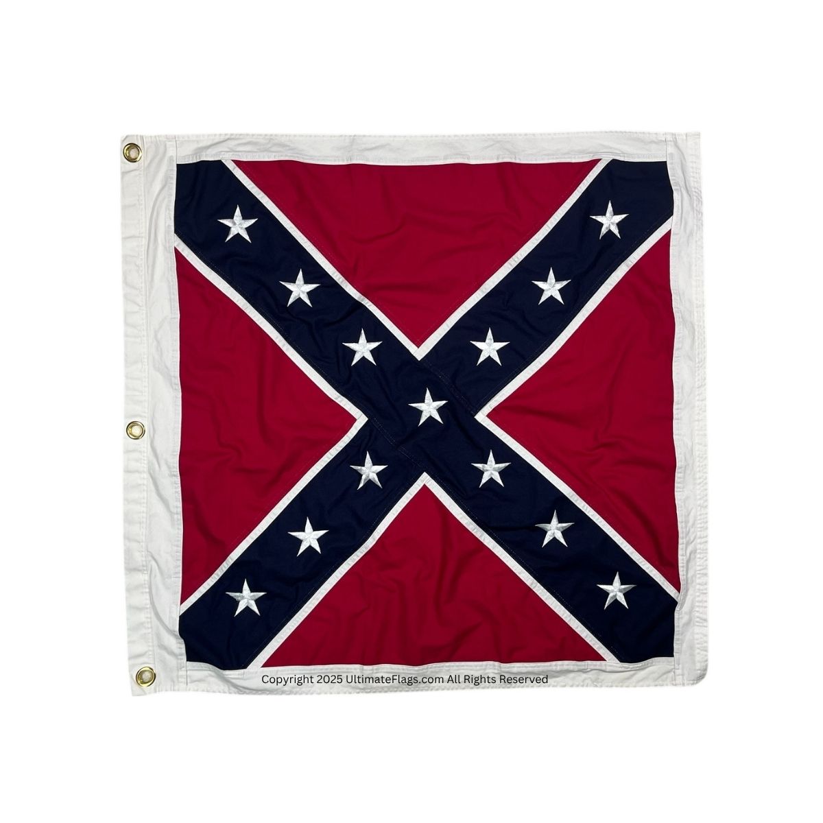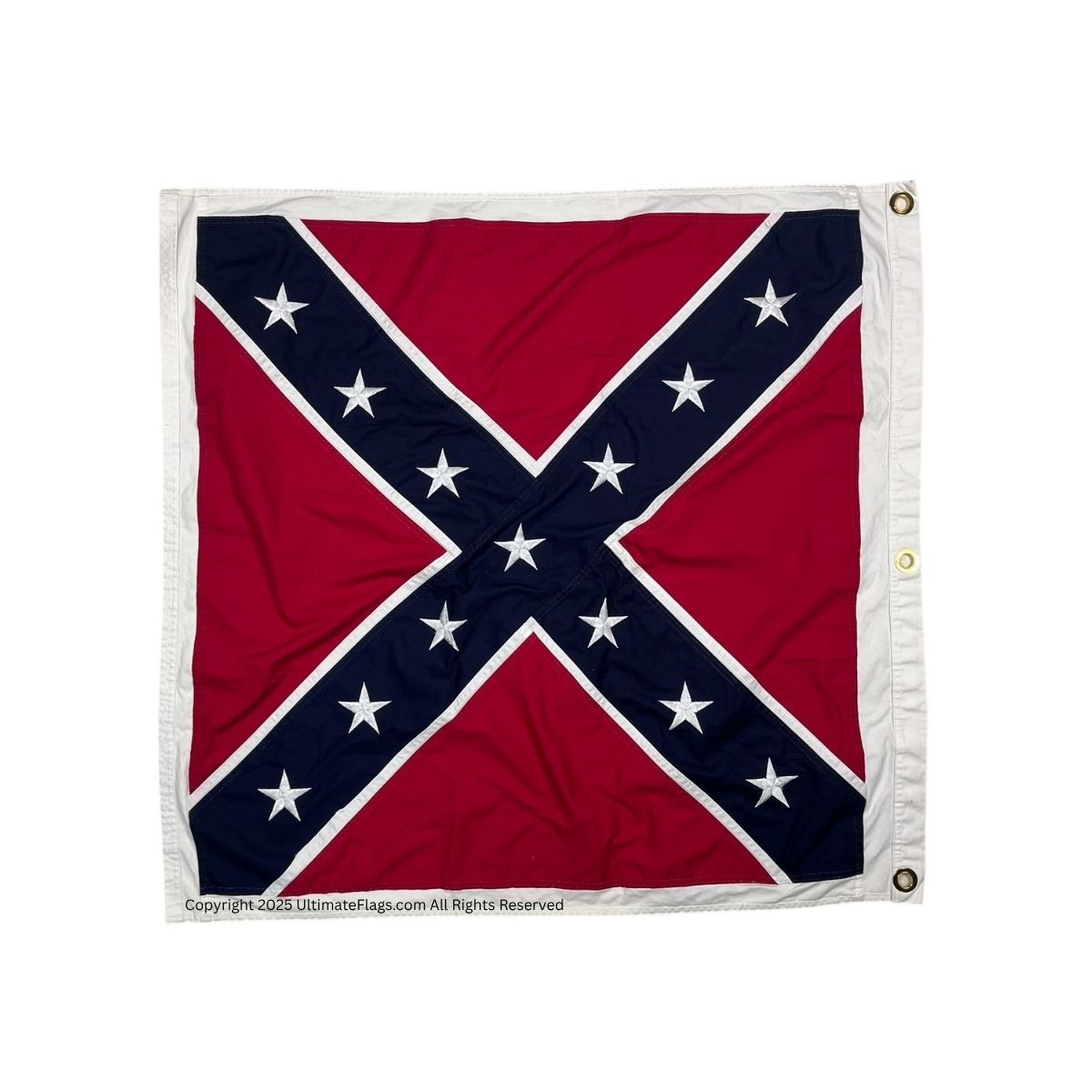 This 38×38 inch square Confederate Artillery Battle Flag is a faithful reproduction of the battlefield flags flown by artillery units in the Army of Northern Virginia under General Robert E. Lee. The white-bordered square design became a battlefield standard after the First Battle of Manassas (Bull Run), where early flag confusion led to dangerous misidentifications.