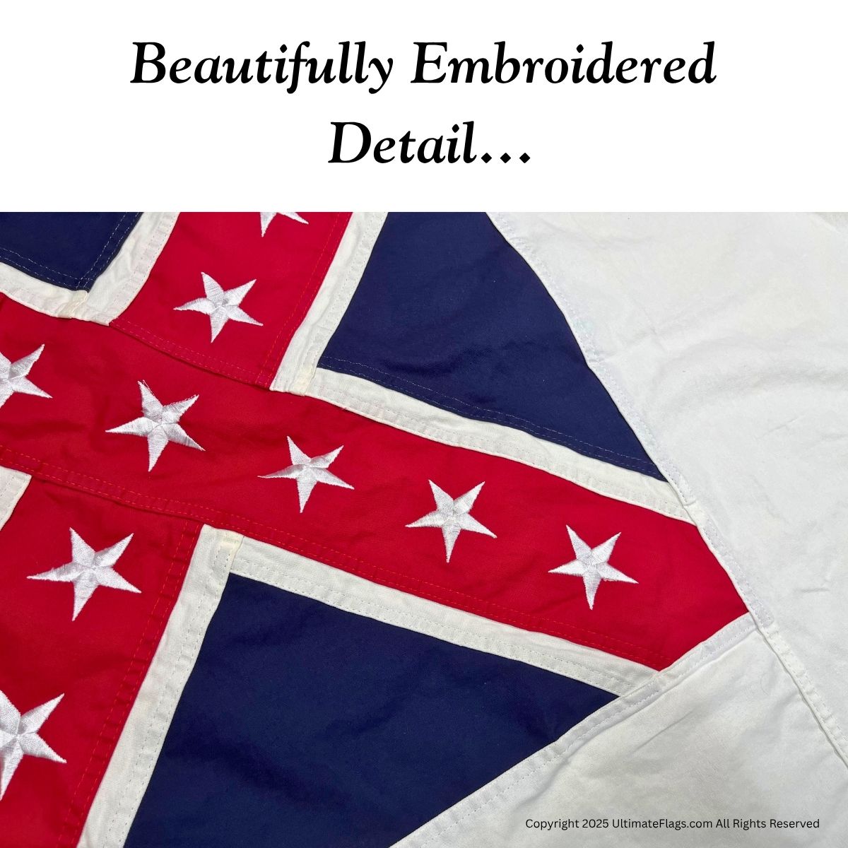 This 3×5 ft sewn cotton flag is a detailed replica of the 2nd National Confederate Garrison Flag flown over Fort Fisher during the American Civil War under Confederate General Sam Bell Maxey. Constructed from heavy ceremonial-grade cotton, this version includes fully embroidered stars and traditional stitched paneling for historical accuracy and presentation quality.