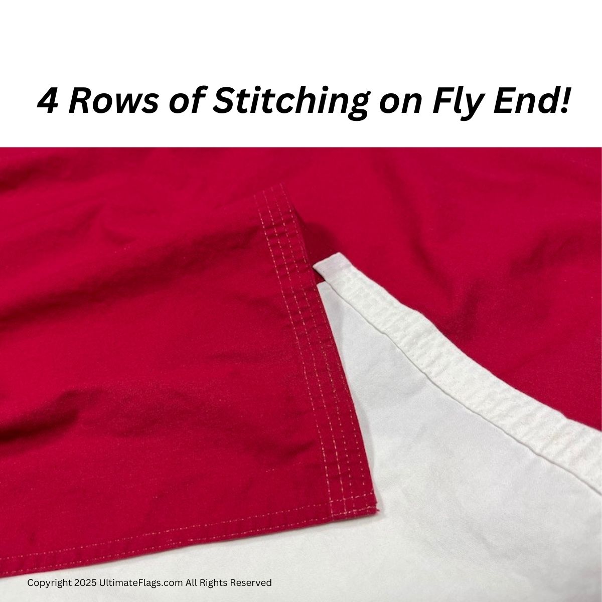 Note on the reverse (backs) of flags: It is standard traditional flag construction that images, words and other adornments on a flag are “backwards” when viewed from behind. It is not correct to sew two standard flags back-to-back in order for them to read the same from both directions.