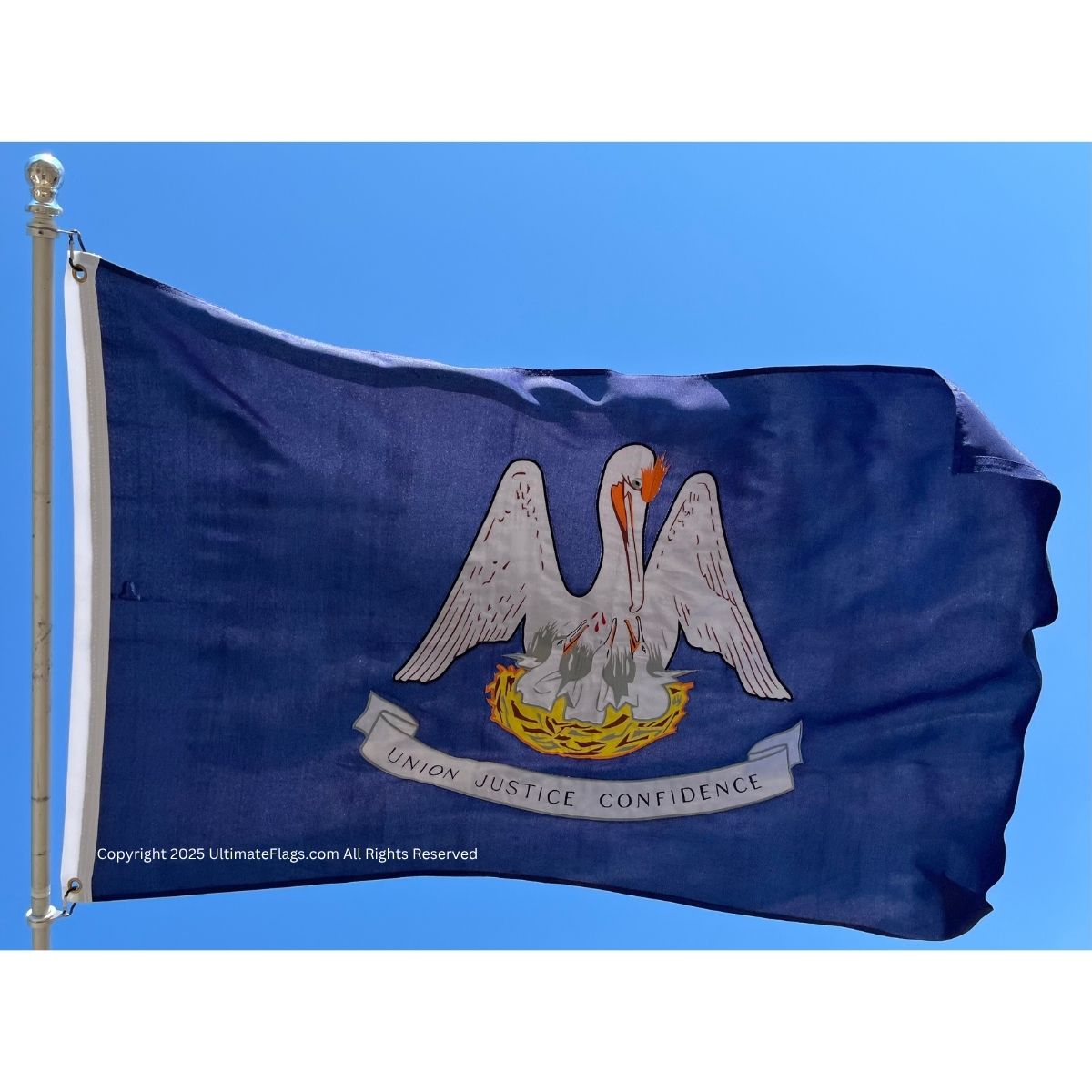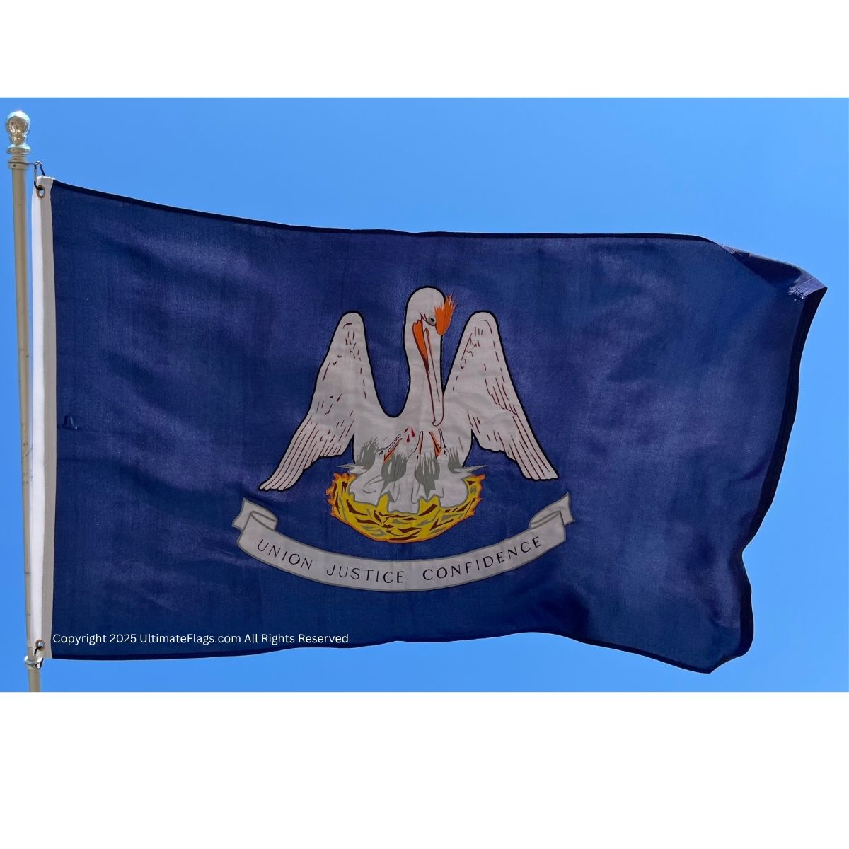 The Louisiana flag proudly showcases the pelican in her piety, derived from Christian symbolism and embedded in the Louisiana state seal. The official motto, “Union, Justice, and Confidence,” appears beneath the emblem. This design reflects the state’s legacy of Southern strength, self-reliance, and constitutional identity.