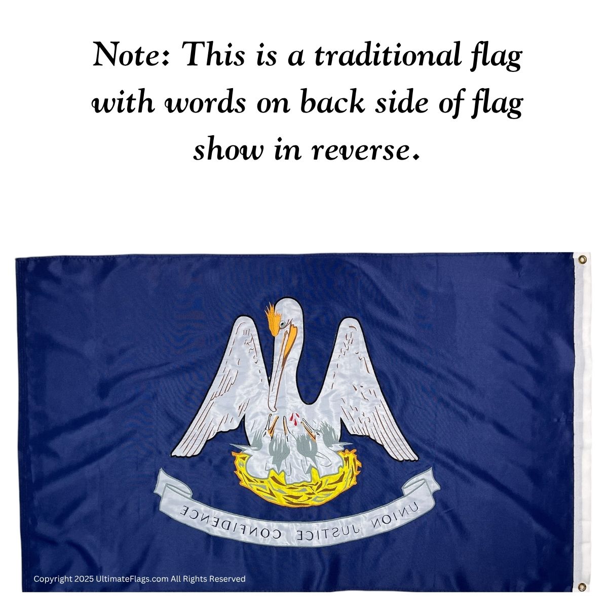 The scroll beneath the pelican reads “Union, Justice, and Confidence,” the official motto of the state of Louisiana.