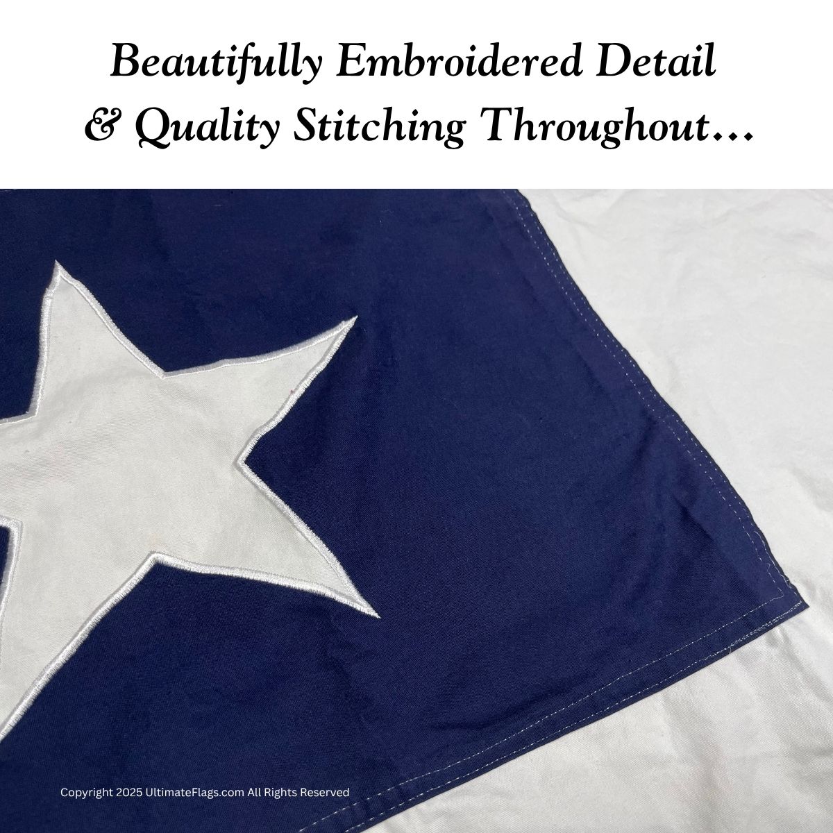This historic 3×5 ft reproduction stays true to those specifications with premium embroidery and accurate period styling.