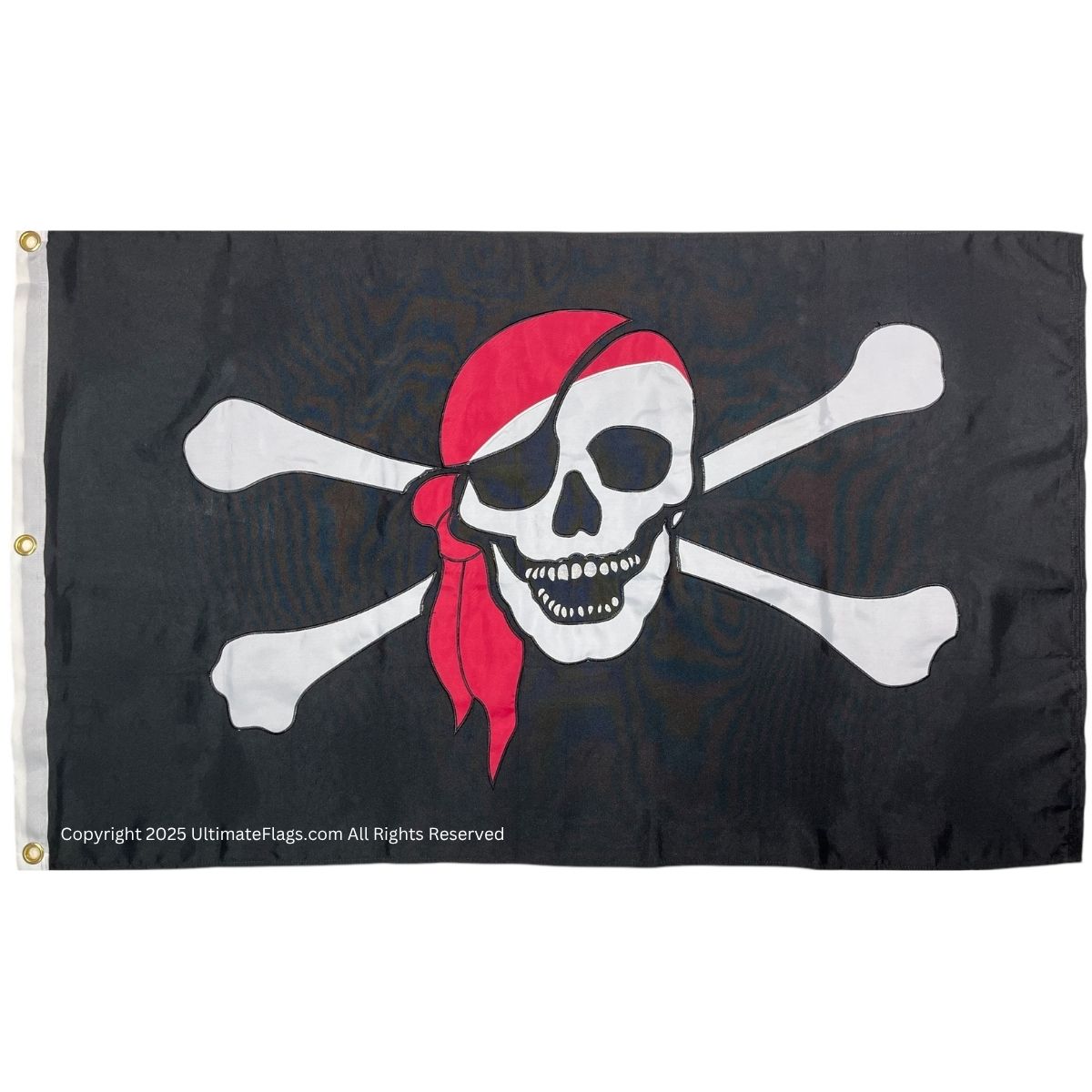 The Jolly Roger Red Hat Flag is a novelty flag. The Jolly Roger Red Hat Flag has a skull with crossed bones, a red hat, and an earring. Also known as a “pirate flag”