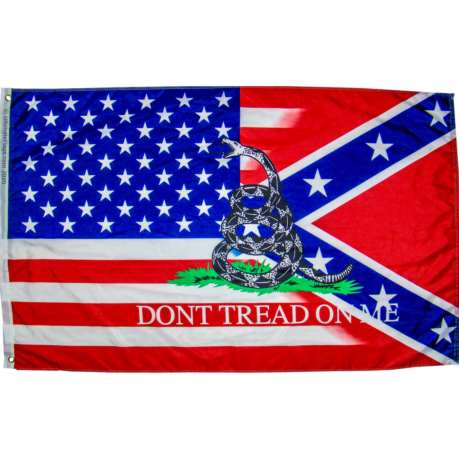 The 50 Star American flag bleeds into the Confederate Battle Flag with the Gadsden Snake “Dont Tread on Me” text below.