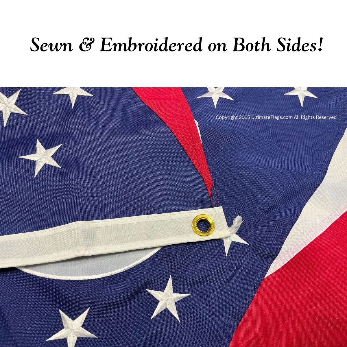 Design: Fully embroidered circle, stars, and stripes – double-sided