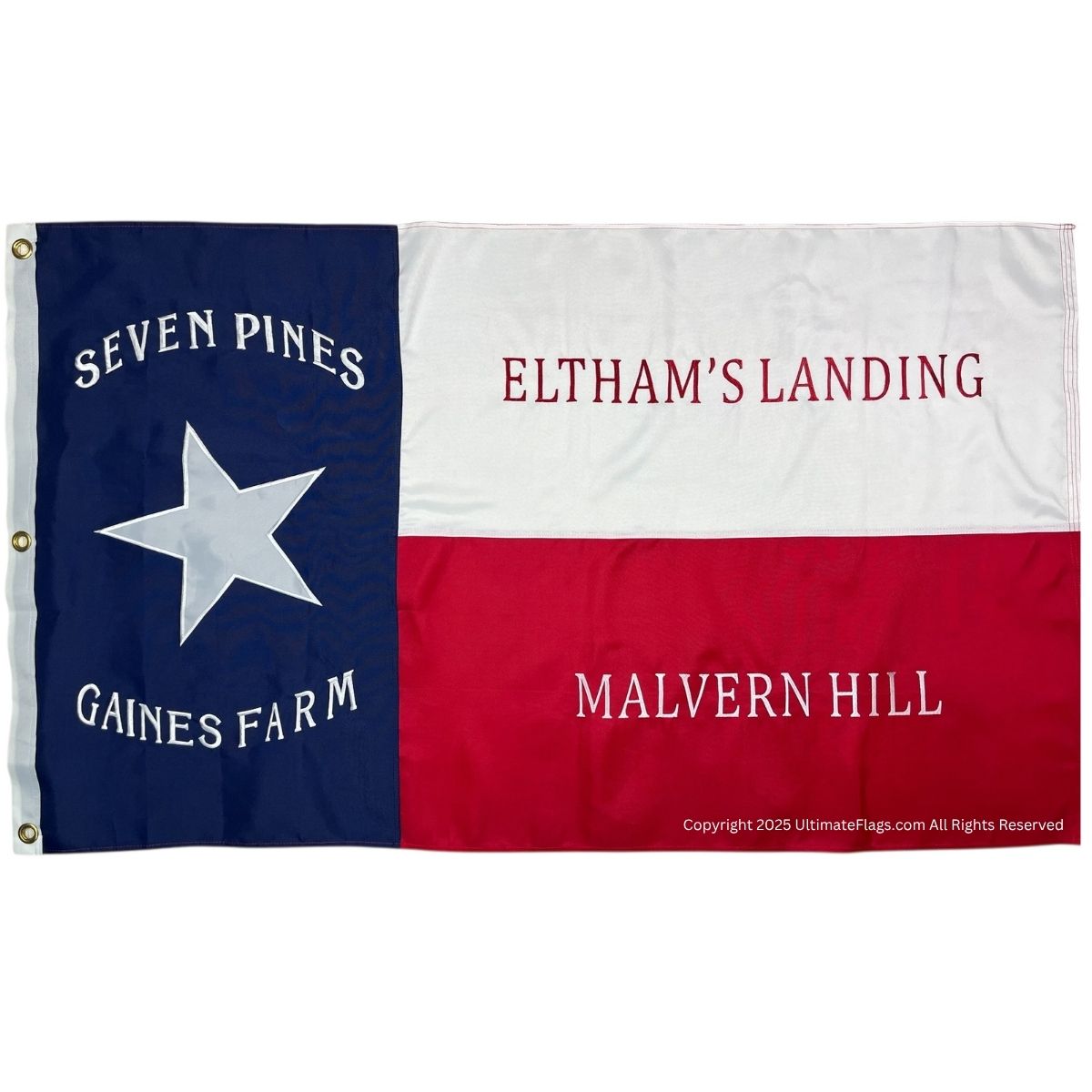 Pay tribute to Confederate history with this 1st Texas Infantry Regiment flag, a replica honoring the legendary “Hood’s Brigade”. This banner features two embroidered battle honors: Seven Pines and Gaines’ Farm — both pivotal 1862 engagements during the Peninsula Campaign of the American Civil War. The 1st Texas Infantry, part of Brigadier General John Bell Hood’s brigade, was known for its fierce combat record within the Army of Northern Virginia. Along with the Stonewall Brigade, they were considered the Army of Northern Virginia’s shock troops. It fought in every major battle of the Eastern Theater except Chancellorsville.